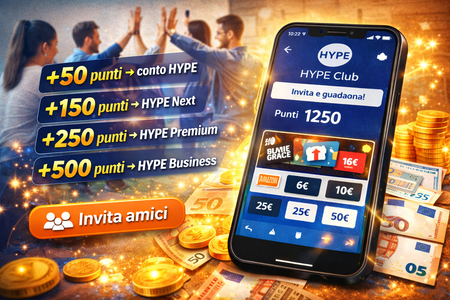 HYPE Club è uno spazio dedicato all’interno dell’app HYPE dove puoi invitare amici e accumulare punti convertibili in Gift Card.